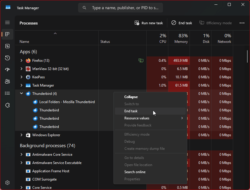 I am very familiar with End Task, which is why I miss it. The Details view of the Task Manager shows that End Task is disabled for thunderbird.exe. Why?