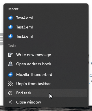 "End Task" is also available to me with a right-click on the Taskbar Thunderbird icon.