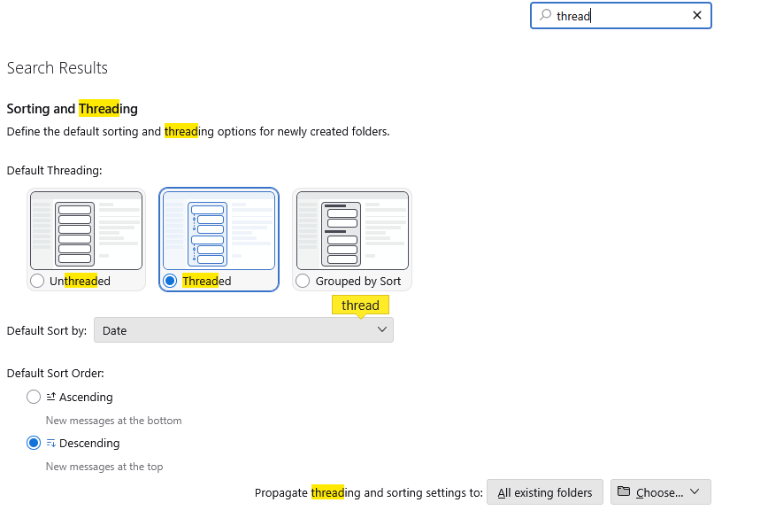 I will include a picture of the settings that replace the Changing default threading mode from that article so you will know them when you find them