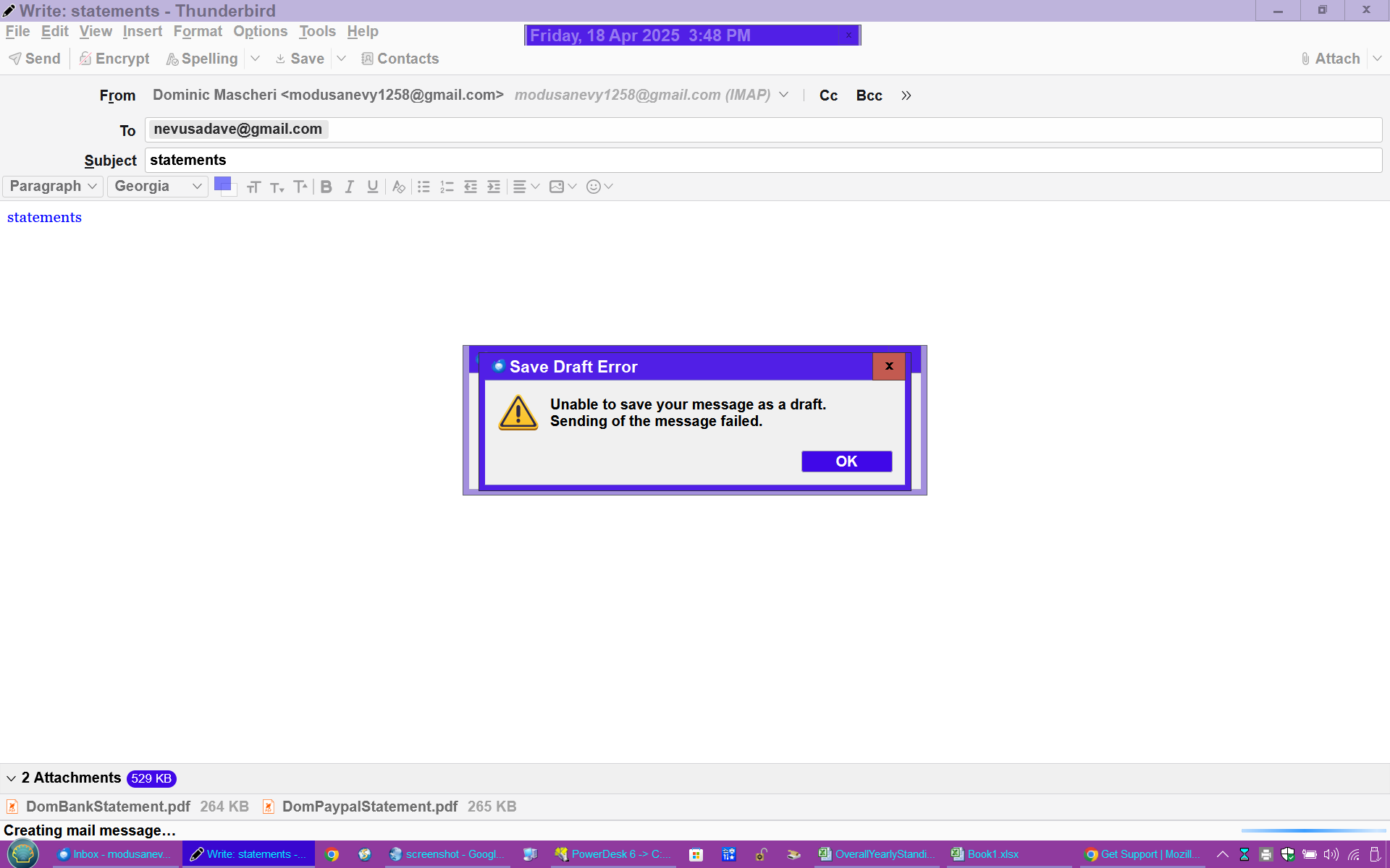 I can receive but not send messages or save drafts (Unable to save message as a draft. Sending of message failed). Please help!