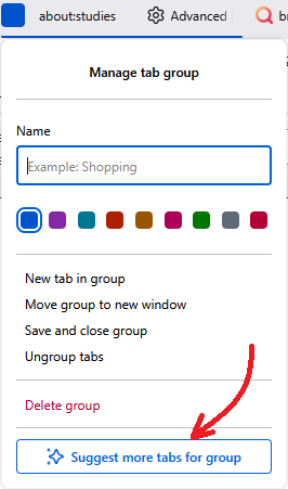 AI Tab Grouping This is a user-initiated feature -- nothing happens without your active involvement. If this feature has been enabled in your Firefox, you will see this new command at the bottom of the context menu for a tab group:More info: How to use AI-enhanced tab groups.
