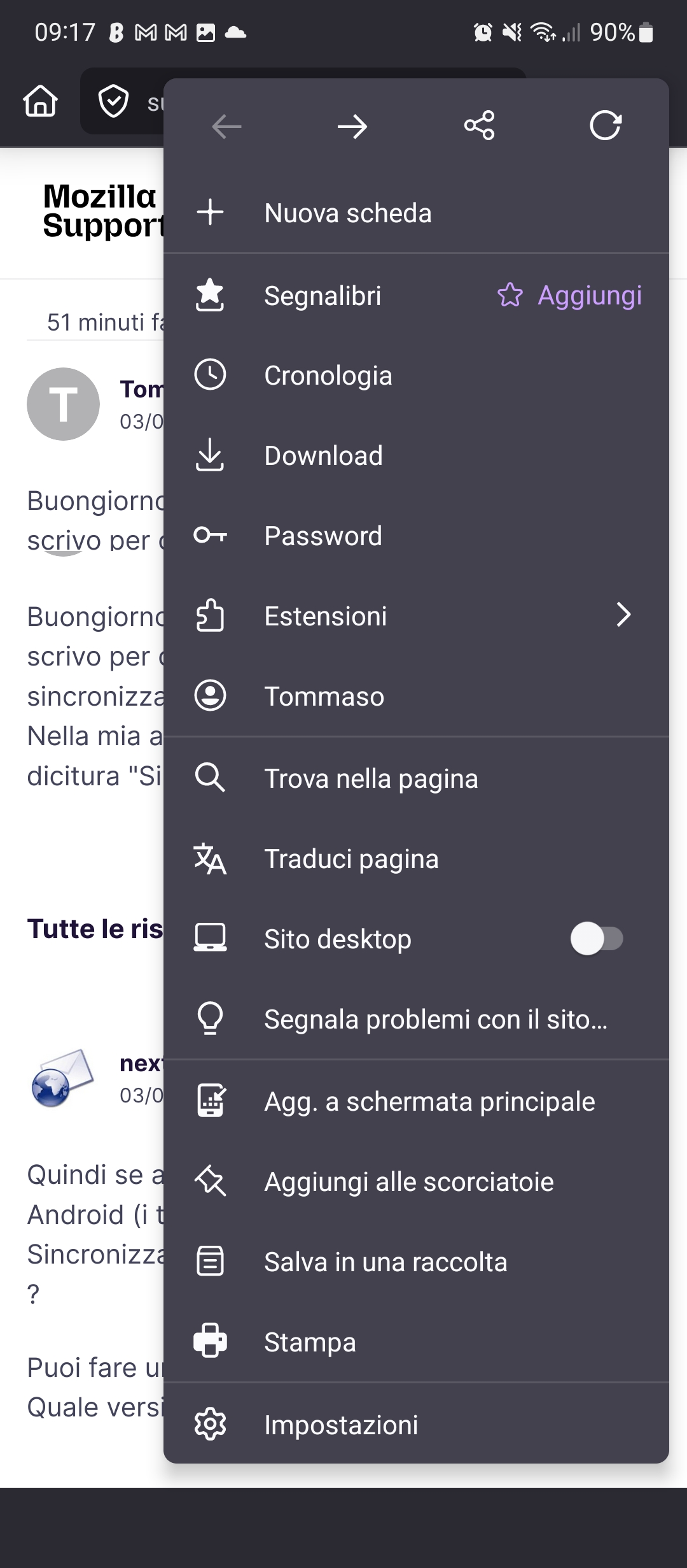 Buongiorno, scrivo per chiedere aiuto riguardo l'impossibilità di sincronizzare le mie app firefox tra pc e android. Nella mia app android non riesco a trovare la dicitura "Sincronizza e salva i tuoi dati".