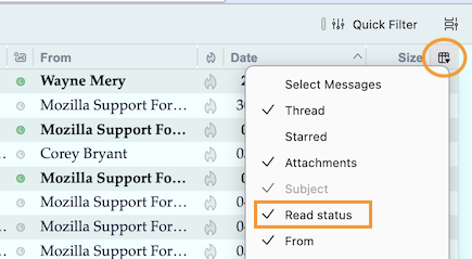 Those 3 column headings don't show on my screen (From, Date, Size) so the 'Read Status' button doesn't appear on their R either! How can I get these headings to show? (None of my emails appear listed in bold! - which doesn't bother me!) Any further advice much appreciated!