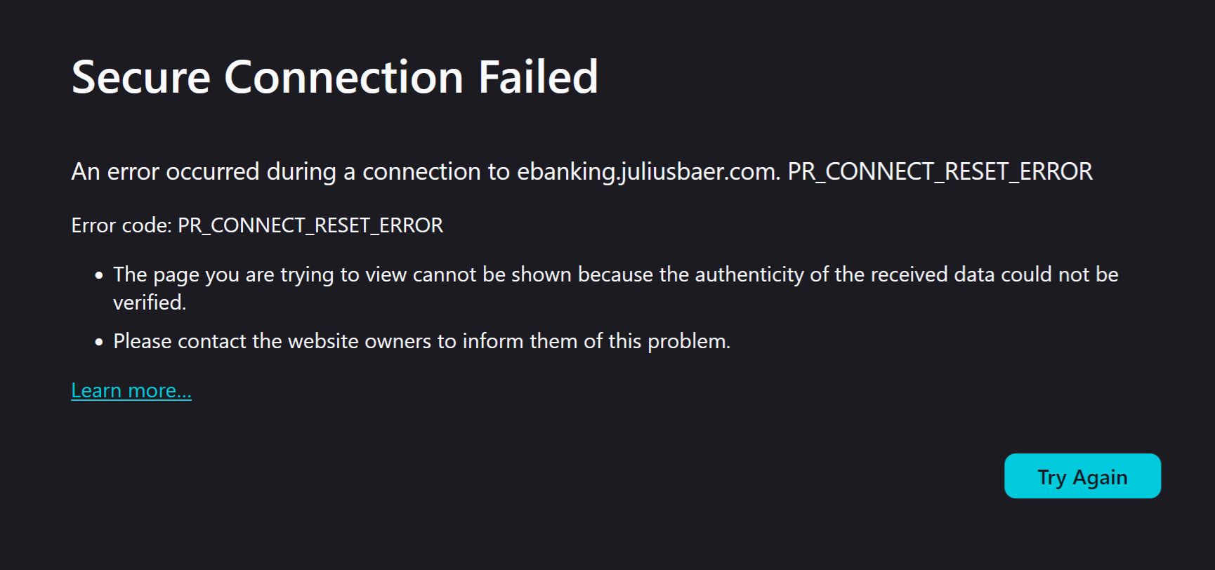 An e-banking site that worked in Firefox for years no longer works in 145.0 under Ubuntu Studio 24.04.1 This is the help page for the error I am receiving: https://support.mozilla.org/1/firefox/145.0/WINNT/en-US/connection-not-secure However, the error message I received (see attached image) is not listed there. Since the e-banking site hasn't changed in ages, I suspect instead something in one of the recent Firefox updates. The site works fine in Safari under Sequoia 15.5 on a MacBook Air, and I can login in Firefox, so I doubt that there is a problem with the site's security certificate. Since both the MacBook Air and the Ubuntu PC are on the same LAN, I also doubt any network obstruction. I haven't found a wax to get any more detailed error information and would be grateful for tips on how to do so. Meanwhile, I would like to at least change from the standart Firefox release to the ESR veersion, but find no information on how to do so. I have currently set up Firefox to be pulled from the instructions in https://support.mozilla.org/en-US/kb/install-firefox-linux#w_install-firefox-deb-package-for-debian-based-distributions-recommended under "For Debian Trixie and Newer" How can I switch from my current Firefox under Ubuntu to an ESR release?