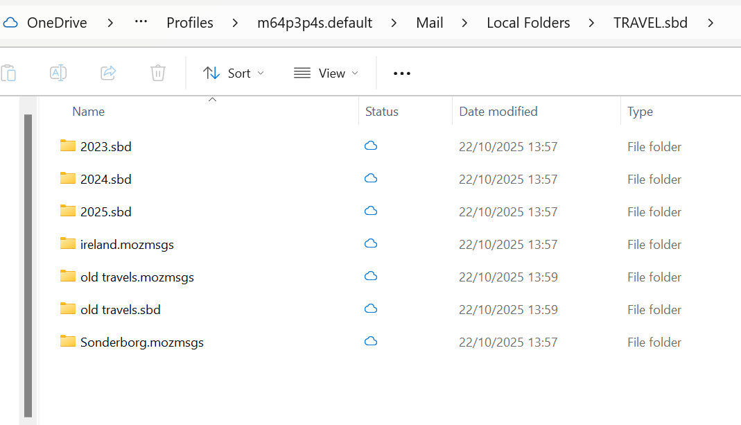 The "file folder" TRAVEL.sbd on OneDrive shown in the left image doesn't contain any mbox (text) files such as "2023", "2024", "2025" neither "old travels", absolutely necessary for Thunderbird to be able to display the folders with the same names in Local Folders in the folder pane. This new screen shot is confusing since it shows TRAVEL as a folder in the Local Folders where as in an earlier screen shot a TRAVEL_ folder is a sub-folder of HELSINKI!