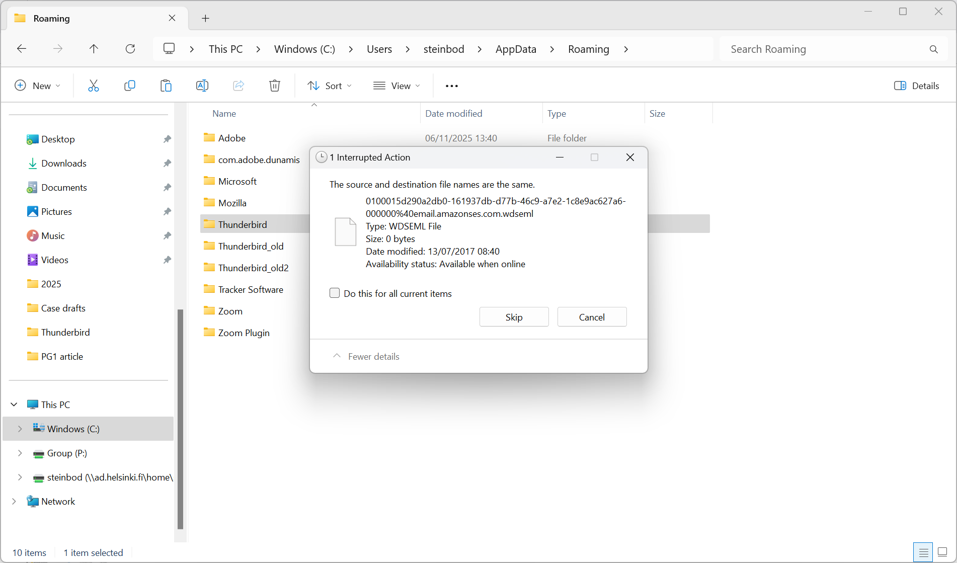 yet now I remember something that happened three weeks back, now that you ask about the 'loss of mbox' files: when I tried to copy from the cloud/ my backup on OneDrive to C: on my new laptop, I consistently got this error message (consistently no matter whether I tried to transfer the Thunderbird/ profiles folder by USB or just by copy & paste --- see second attached screenshot - could that be the answer? THANKS !!!!!!!!!!!!!!!!!!!!!