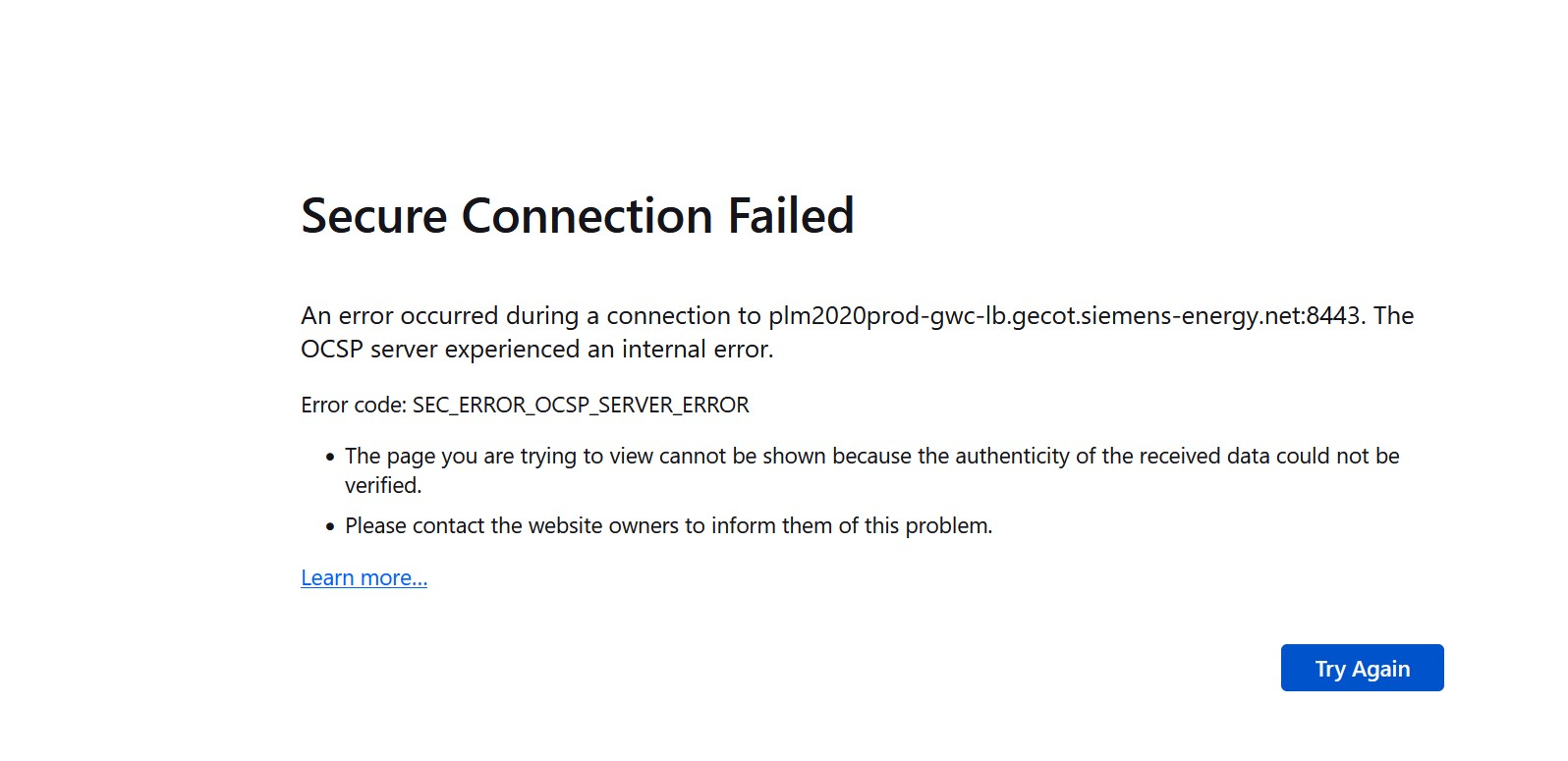 An error occurred during a connection to plm2020prod-gwc-lb.gecot.siemens-energy.net:8443. The OCSP server experienced an internal error.