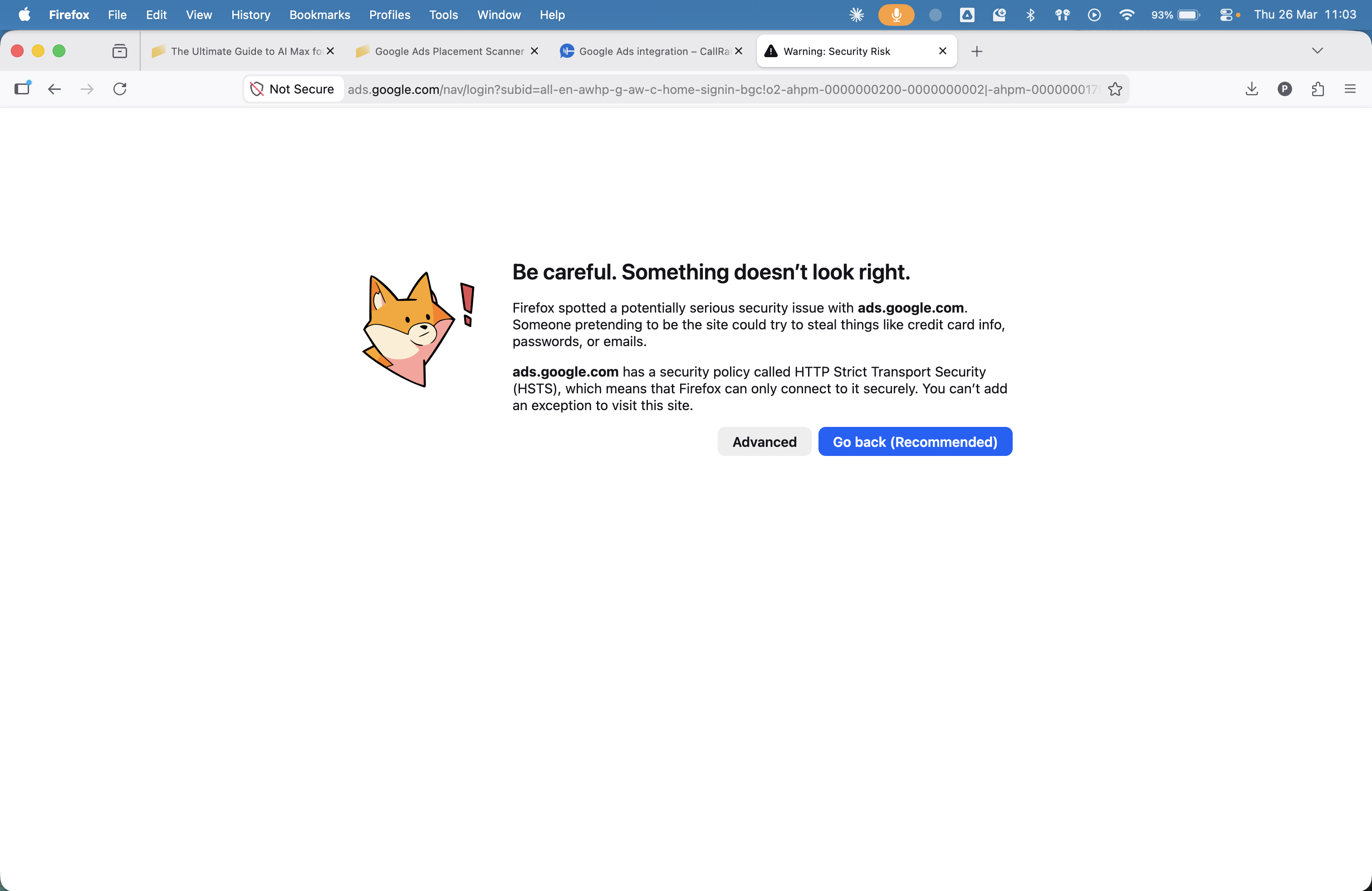 Hi Love Firefox and use it every day to manage clients Google Ads accounts. Updated to latest version and now I'm getting this warning when I'm trying to access ads.google.com Doesn't appear that I can add an exception, is there a work around that I can use. Look forward to hearing back. Thanks in advance