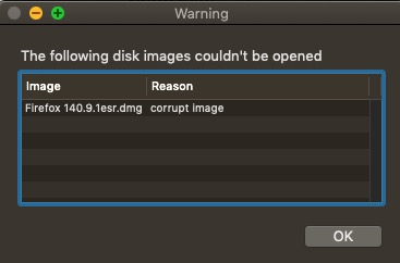 The repeat Firefox 140.9.1 esr dmg does not work for me it says a currupt image? often the Firefox I am using crashes my cumpoter and I have a long restart