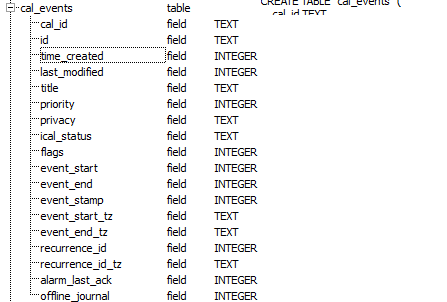 From looking into the local.sqlite database file the cal_events table has a field called time_created. Unfortunately when I try to export this, the format is unknown so it just exports as a number.
