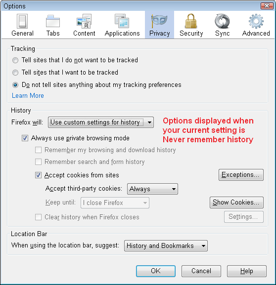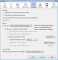 - Or do you have "Firefox will: Use custom settings for history" with one or both of these: