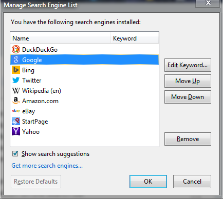 - In the upcoming window, you have all your search engines listed. To change the order, simply click one search engine and then select Move up or Move down from the buttons on the right side in order to change the order of the search engines.
