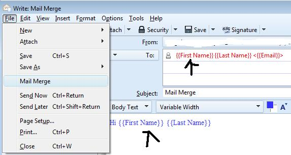 When I set up mail merge, I had three columns 'First Name' 'Last Name' and 'Email' in a .csv file.