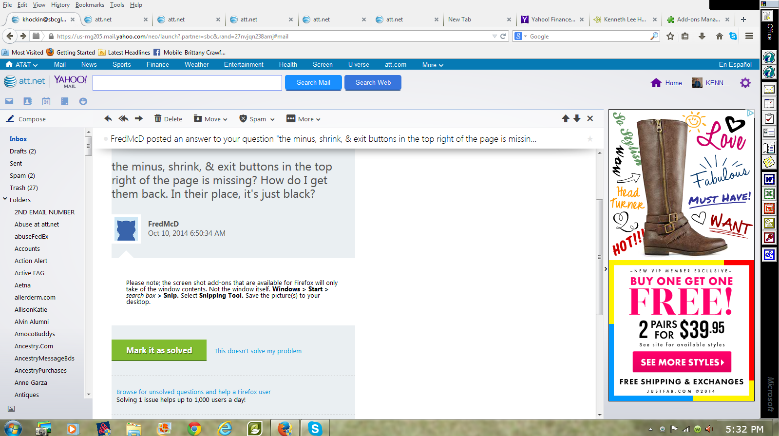 The only addons I have is Webroot & Skype. I did set Firefox to the default browser & it's back to normal with the exception that I still have the black space where the minus, expand, & exit goes, which is OK, it still works. I did the snip on the whole screen, not sure if that's what you are asking, & I saved it to the desktop and am attaching to this note. Let me know if I need to do anything else?
