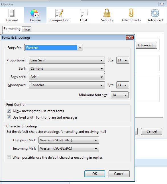 Thunderbird will normally use each message's stored character encoding, or auto-detect it, but you can set a default character encoding for message display by using this pulldown. Post image of what you have in the fonts and Encoding window. See image below as example