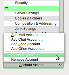 Thank you. I don't have the checkbox here. I'm guessing that's due to a setting in Windows Explorer to offer a select checkbox against every item. I don't think it's especially useful or relevant to this particular drop-down menu. In my case, the "Default account" option on the menu is greyed out on the account that is already designated as the default, and active on all the others. There's no distracting checkbox to confuse matters. You might like to try the ManuallySortFolders add-on as an alternative way to set the default account. https://addons.mozilla.org/en-US/thunderbird/addon/manually-sort-folders/