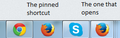 Clicking the pinned one on my taskbar (the one to the left in the picture) only opens more firefox browsers and stocks them in the same "tab" as the others on my taskbar (the one to the right in the picture)