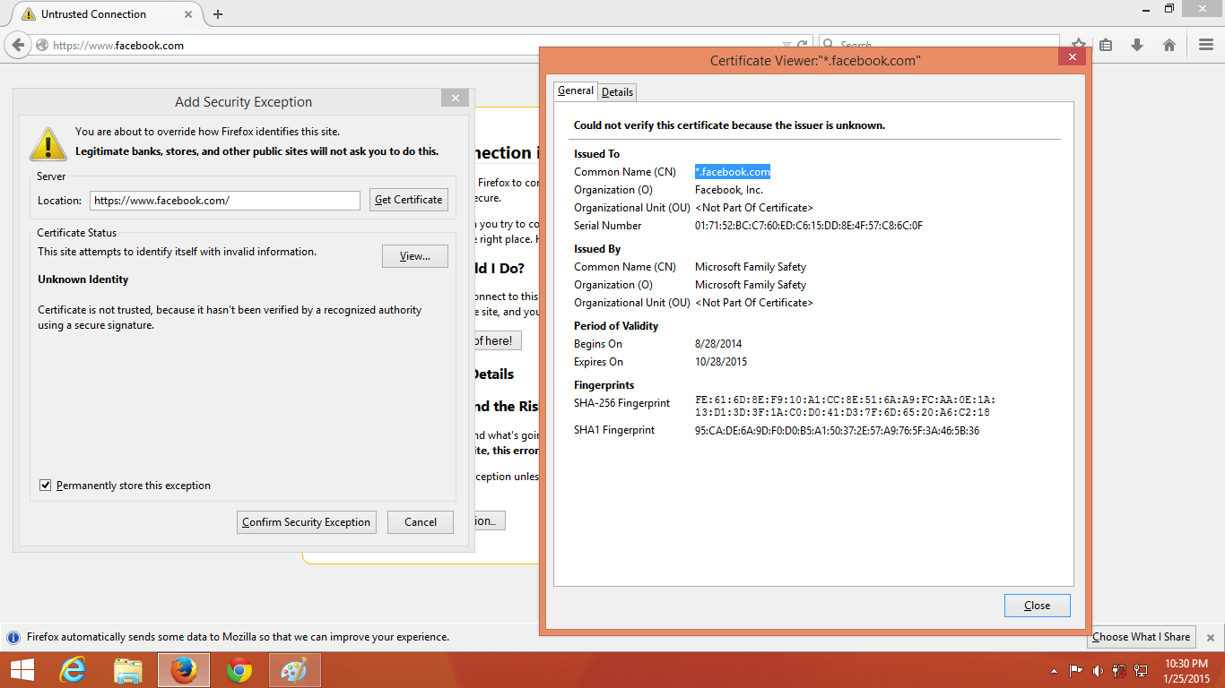 Facebook, google ERROR sec_error_unknown_issuer in Fresh Firefox 35 windows 8.1
