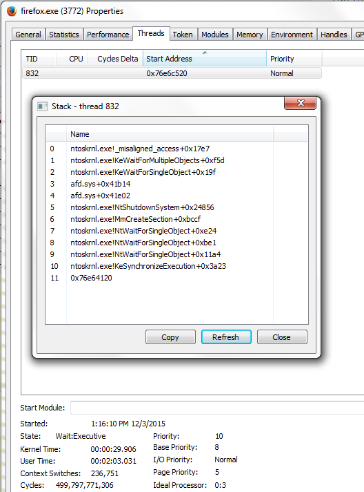 Also, I did a search on "afd.sys", it is "Ancillary Function Driver for WinSock". I'm not sure how this affects Firefox. I cannot stop or restart this service.