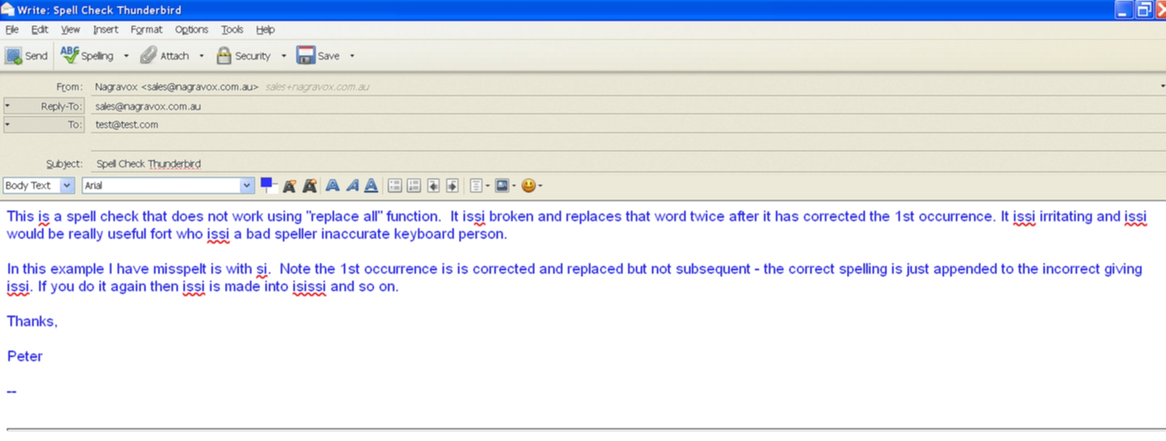 When I use spell check it works fine except when I chose "replace all" function. It does not replace it just appends the correct word to the incorrect word making a bit of a mess of the email. This has been occurring for some time and updating does not help. I have the latest update. It used to work fine many many updates ago about 2 - 3 years ago? I just tend to not use that function but it would be very useful if I could. Thanks. I love Thunderbird its great. KInd Regards, Peter