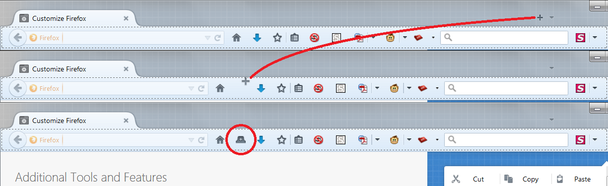If you mean next to the home button on the main toolbar, you could try dragging the "+" button to the new location in Customize mode. Screen shot example attached.