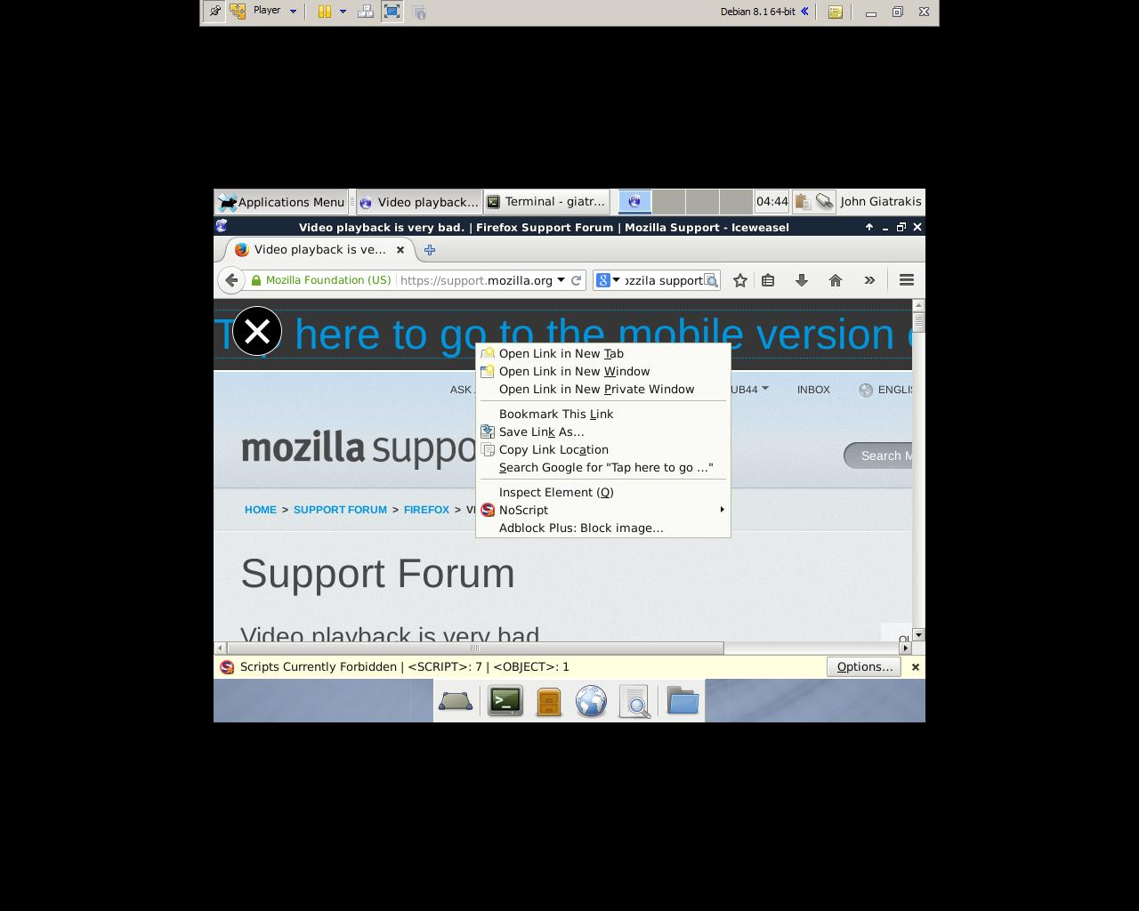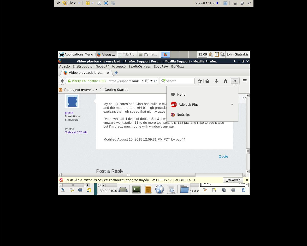 And to upload a screenshot from Debian 8.1 emulation i found a nightly version 38.0.5 that my favorite addons no script and addblock plus did upload without a problem even with 2 Gbytes ram and 2 cpu's i didn't had a problem to view and listen vods in youtube i need to test and Solaris but in Debian there are many Greek servers that have the installation files. Is better to download the zip file and use make install and make to be sure that is fully compatible with your system this what i did this time.