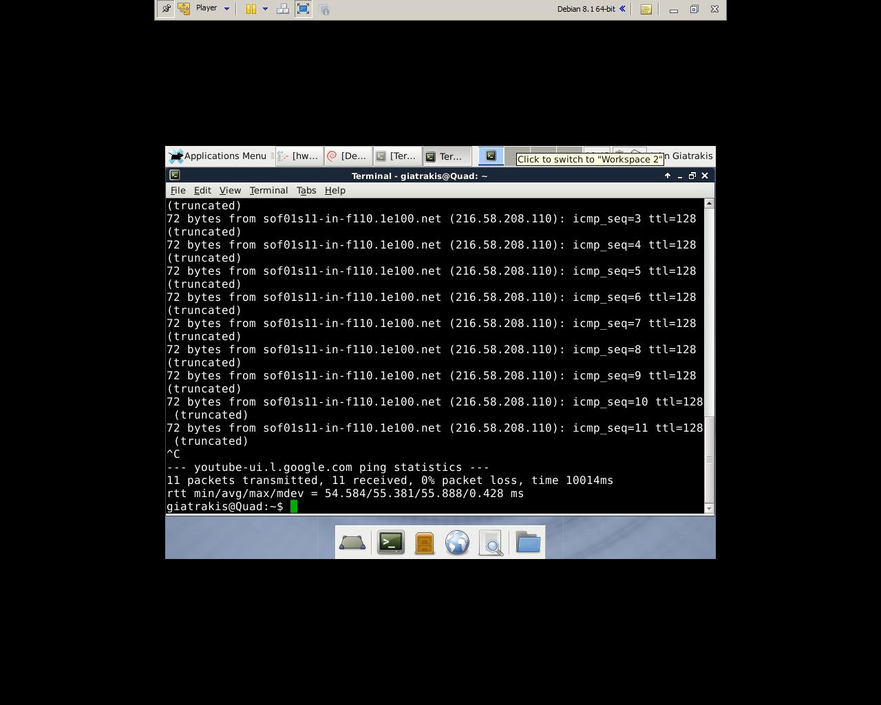 mean while i solve the mystery why i see the vods so clearly i open another terminal and i did a ping to youtube look the 3rd image how low times i have the Gbit (cat 6 sftp) Ethernet really rocks ha?