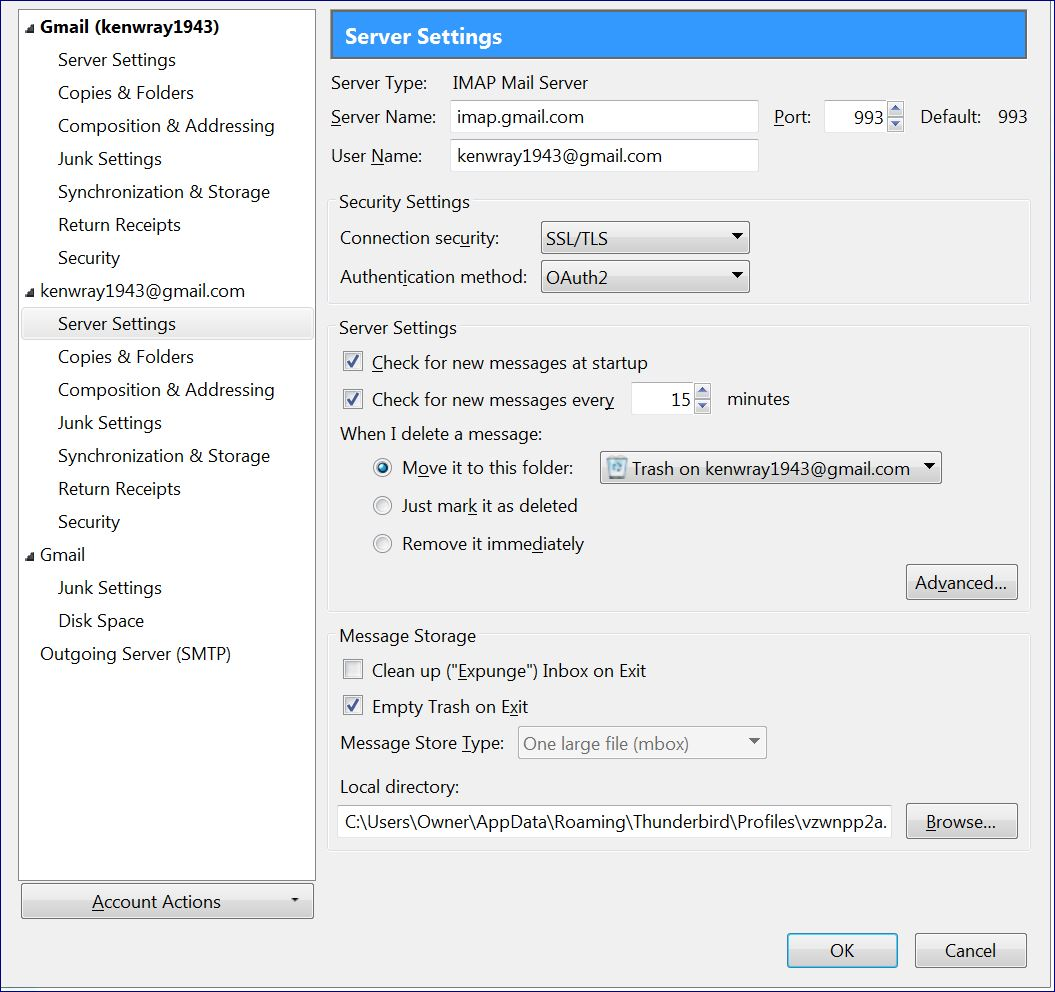 Mail and News Accounts account1: INCOMING: account1, , (imap) imap.gmail.com:993, SSL, OAuth2 OUTGOING: smtp.gmail.com:465, SSL, OAuth2, true