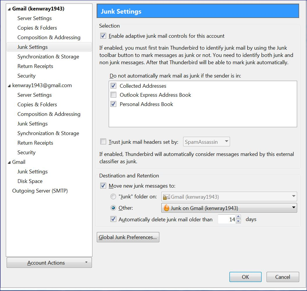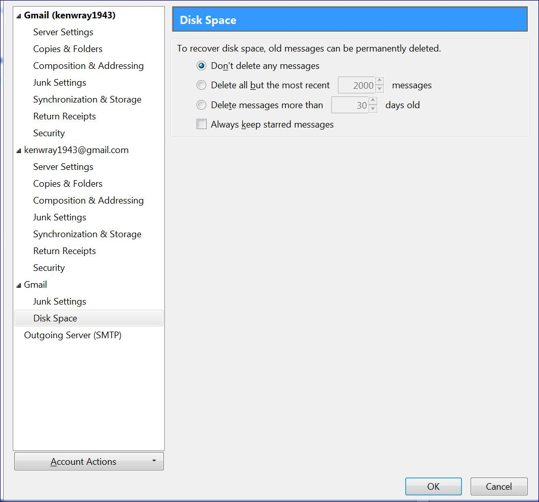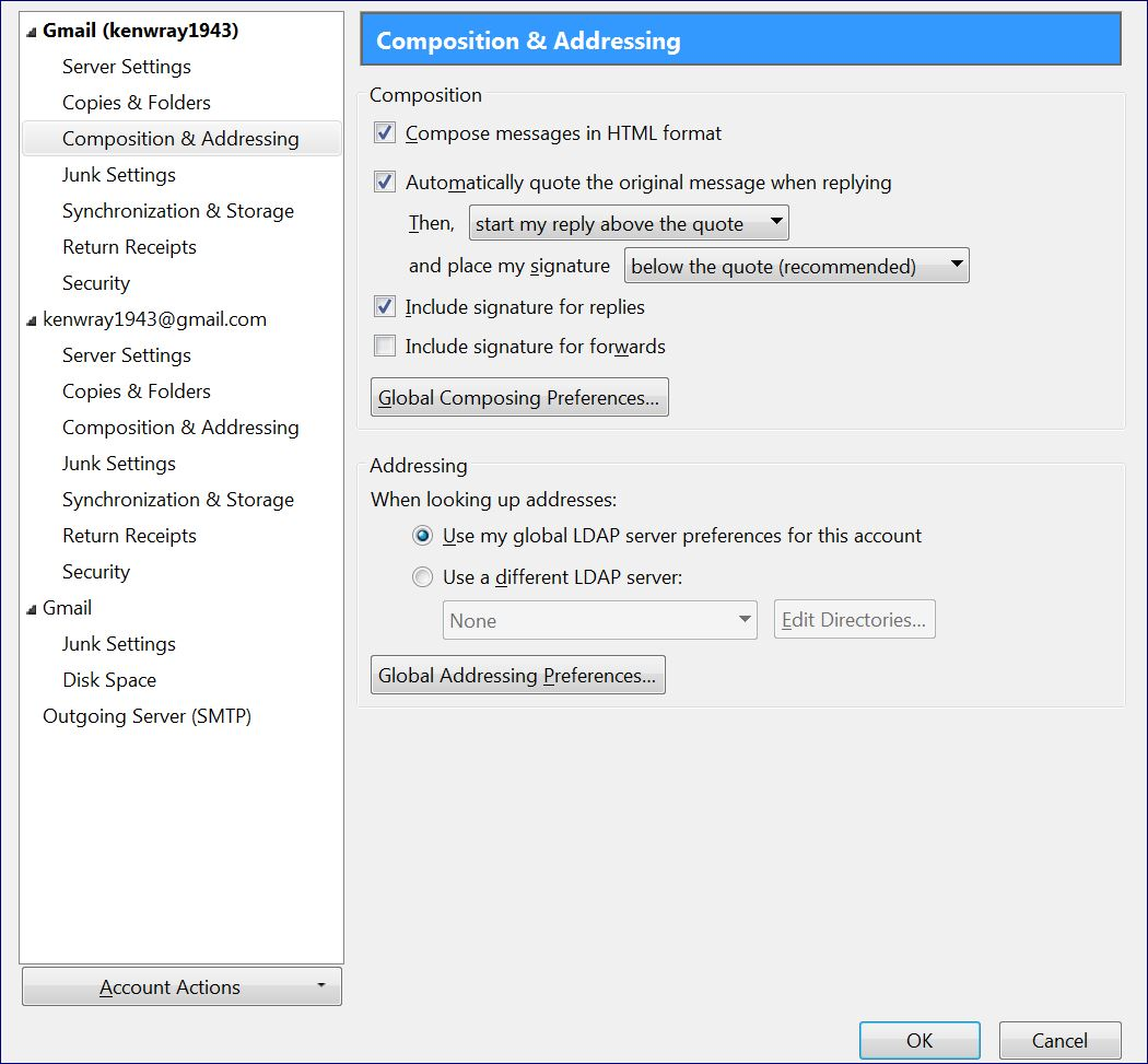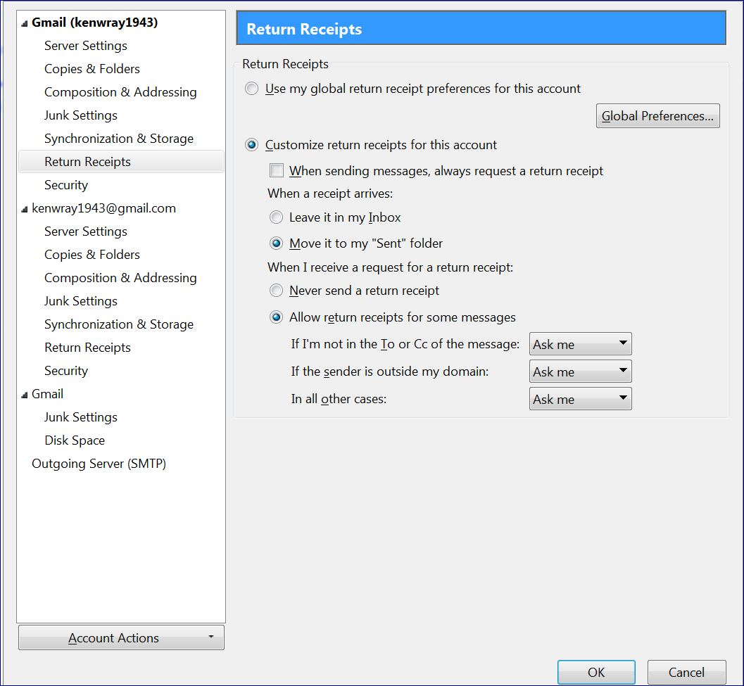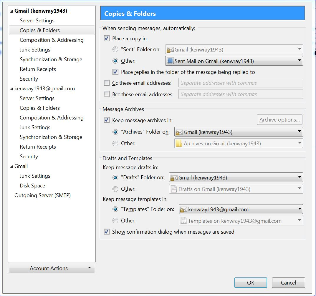 right click on mail account in left Folder Pane and select 'Settings' Assuming the mail account name says 'Gmail (Kenwray1943)' bottom right you will see 'Outgoing Server (smtp)' Does it say you are using: Outgoing Server (smtp): kenwray1943 - smtp.gmail.com OR Outgoing Server (smtp): Google Mail - smtp.gmail.com(default)