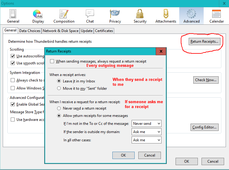 To set up an auto always request a return receipt and determine how Thunderbird handles return receipts: