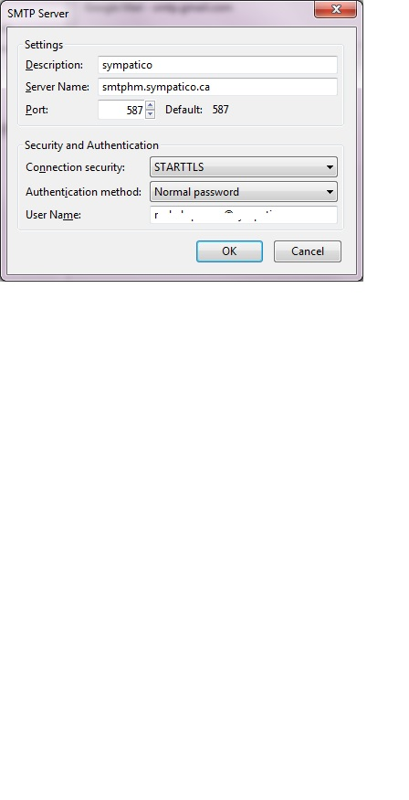 account2: INCOMING: account2, , (pop3) pophm.sympatico.ca:995, SSL, passwordCleartext OUTGOING: smtphm.sympatico.ca:587, alwaysSTARTTLS, passwordCleartext, true OUTGOING: smtphm.sympatico.ca:587, alwaysSTARTTLS, passwordCleartext, false
