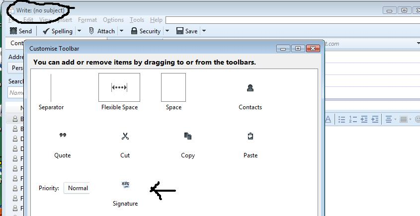 Open a Write window. right click on the toolbar and select 'customise' or View > Toolbars > Customise Drag 'Signature icon' onto toolbar. close customise window - click on 'done'