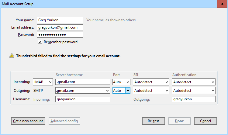 The automatic configuration isn't working. The first time, I manually set all of the fields, using port numbers I found at the gmail site, but I set the authentication fields wrong. After I got your message, I just set the server names and the IMAP port number, and Thunderbird set the rest, but it set the authentication fields wrong. Once I set those, I was connected, after a mere 12 hours of trying everything I could think of, and failing. Also, the Windows mail app connected automatically, so the problem seems to be somewhere other than my connection to my ISP.