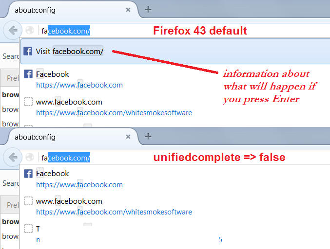 tgchan saidjscher2000, your suggestion disable all autocomplete url, which I do not want.That should not happen. If you turn off the unifiedcomplete, the URL bar should behave the same as Firefox 42. (Screen shot example attached.) Are any other urlbar preferences disabled in about:config?