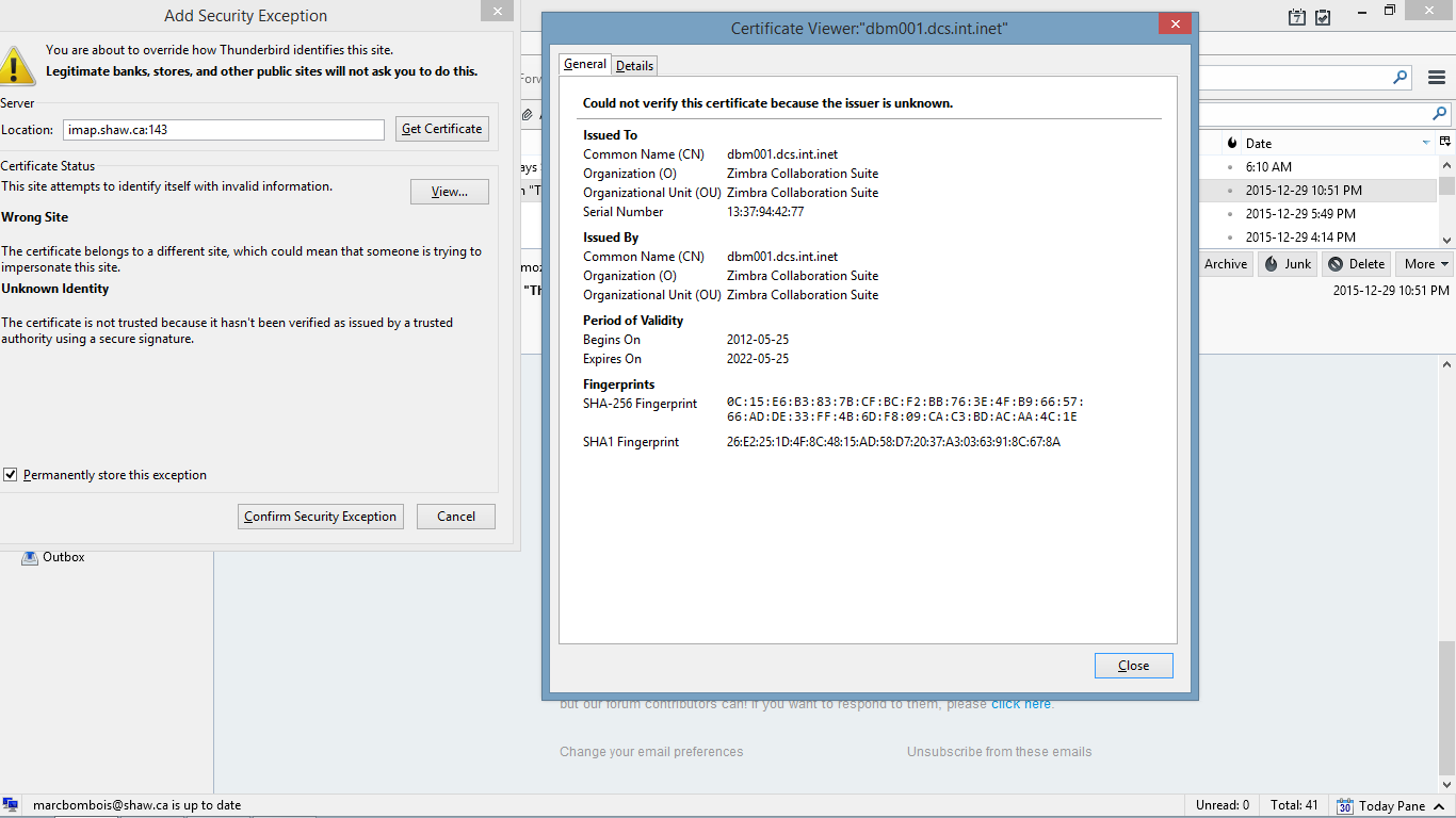 Timestamp: 2015-12-29 8:34:08 AM Error: imap.shaw.ca:143 uses an invalid security certificate.