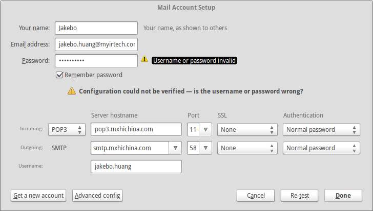 Currently, your 'username' is the part before the '@' in your email address. Suggest you try typing in your full email address and click on 'Re-test' button.
