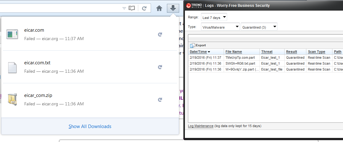 On my Firefox, all of my attempted downloads of the EICAR file show as "Failed" without explanation. By cross-checking the log in my security software, I can see that it grabbed them and quarantined them before Firefox could move the file from the Windows TEMP folder to my designated downloads folder. (Screen shot attached, the path is cut off but it's the TEMP folder.)