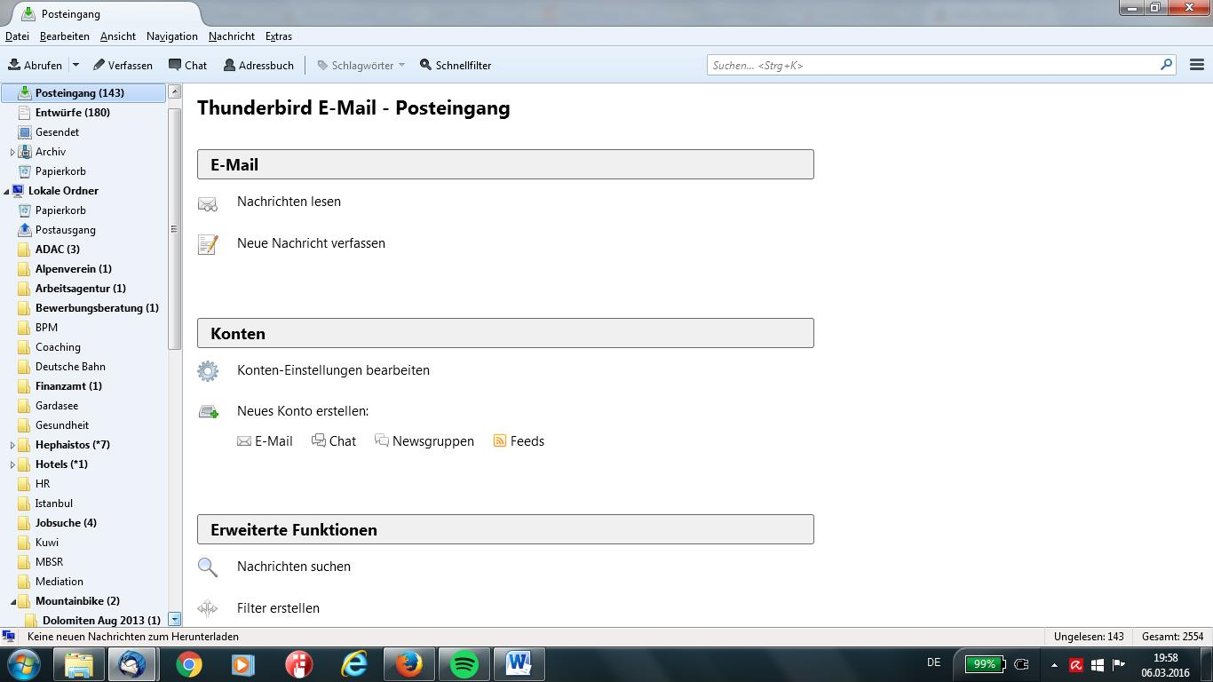 I can only access my Thunderbird inbox and local folders via search function and can't write e-mails at all