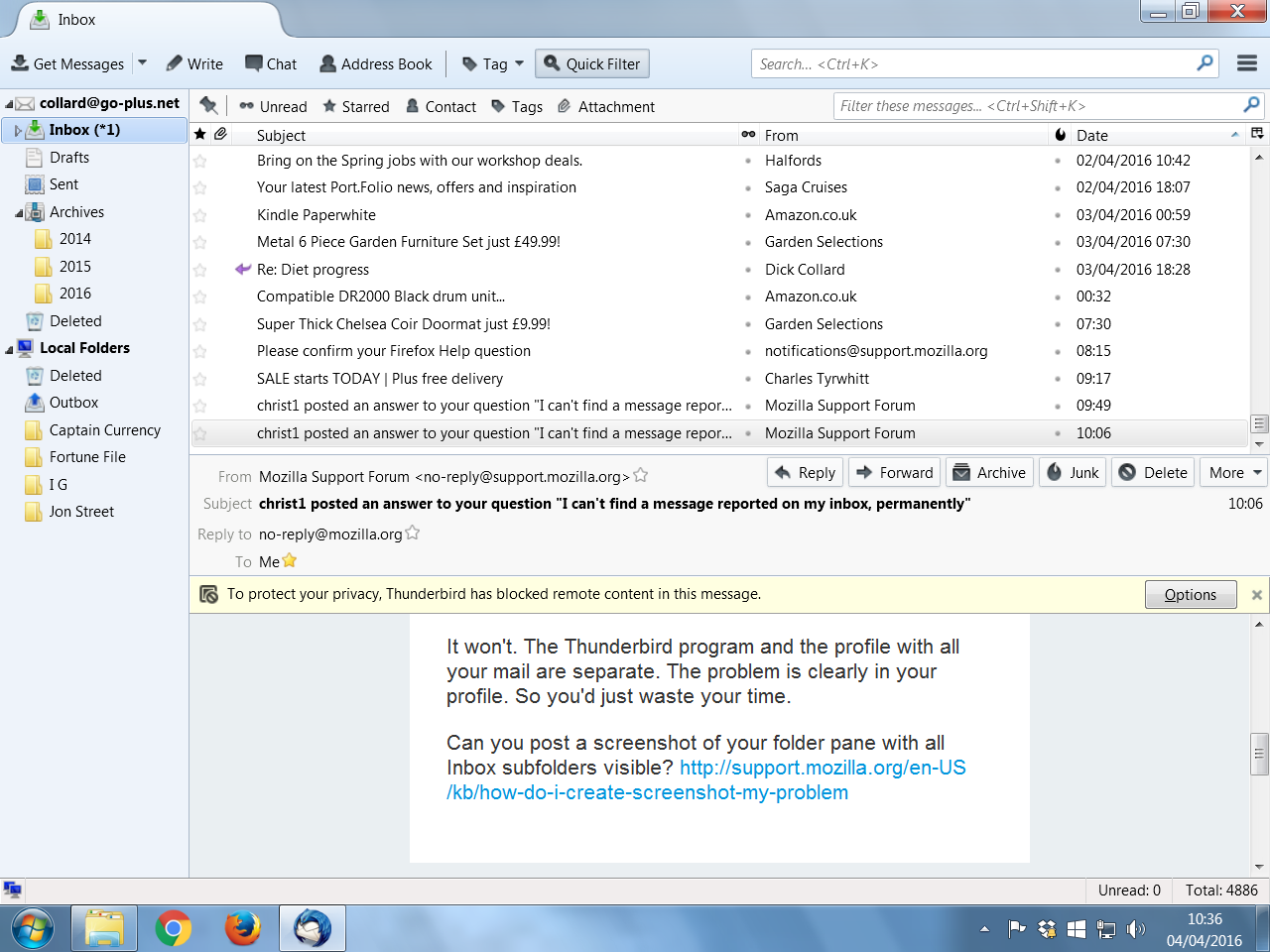 Hi, As far as I can tell, my earlier screenshot included all the folders and sub folders on my email account under "collard@go-plus.net". I have included the picture again, in case something went wrong last time but the picture I have on file shows all the folders. The folder that is missing is a sub folder of the main inbox and was labelled "tennis" as I am chairman of the local tennis club.