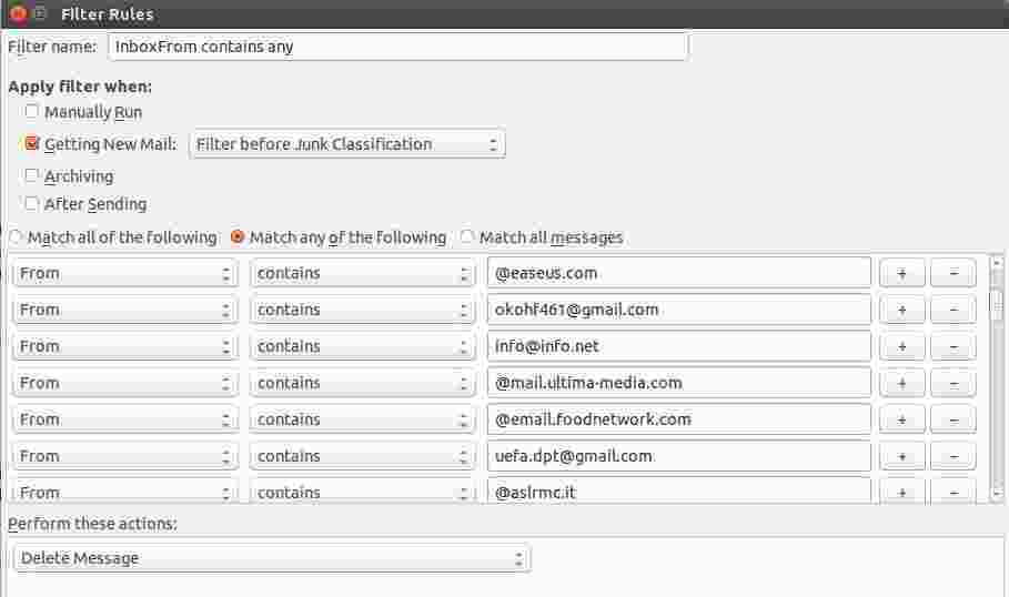 I would have thought that one filter for all unnecessary emails is much quicker than repeating the same filter for each subsequent email that one also wants to delete. ---'Move Up' & 'Move Down' is only a manual task, better 'twould be to have an automatic sort. ---Can you offer any advice on the @, i.e. is this symbol necessary when only the domain name is listed? Thanks for quick reply.
