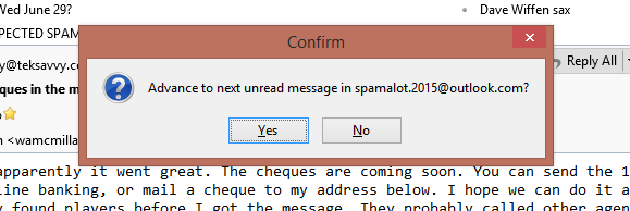 "Advance to next message in xxxx@xxxx.com? (email account) [Yes] [No]"