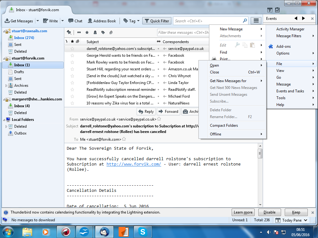 I want to add another email account, but do not have the 'New' option in the File menu.