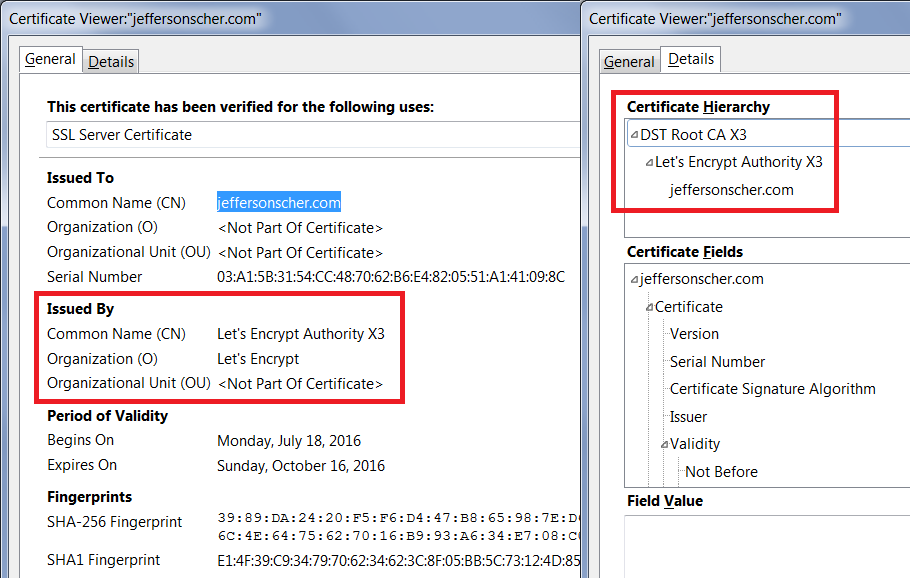 This should pop up the Certificate Viewer. Look at the "Issued by" section, and on the Details tab, the Certificate Hierarchy. What do you see there? I have attached a screen shot for comparison.