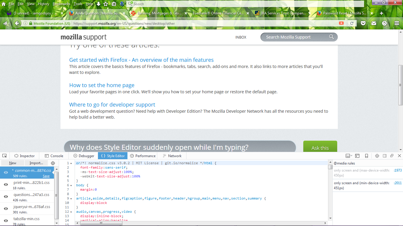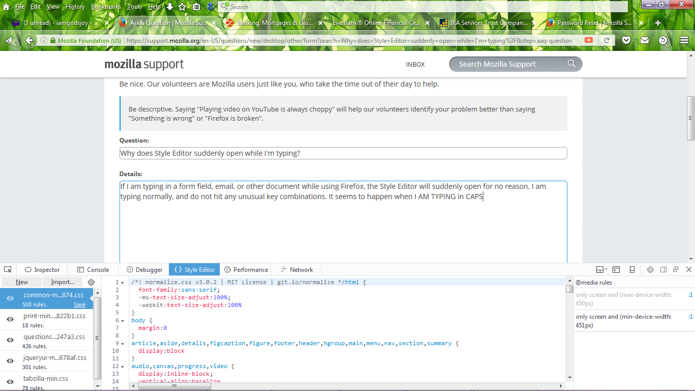 If I am typing in a form field, email, or other document while using Firefox, the Style Editor will suddenly open for no reason. I am typing normally, and do not hit any unusual key combinations. It seems to happen when I AM TYPING in CAPS, which is annoying, as you can see. I use Yahoo mail in Firefox and this happens frequently while I am composing. And it has just started happening in the past few days after rebooting my computer. I use WIN 7 and have the latest Firefox update. Any suggestions?