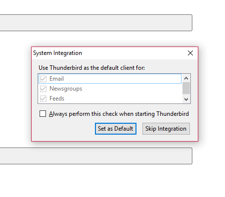 Thunderbird menu: Tools: Options: Advanced section: General tab See my screenshot below. Disable the option "Always check to see if Thunderbird is the default mail client on startup". Then press the "Check Now" button, and disable the option, "Always perform this check when starting Thunderbird". Then press the "Set as Default" button.