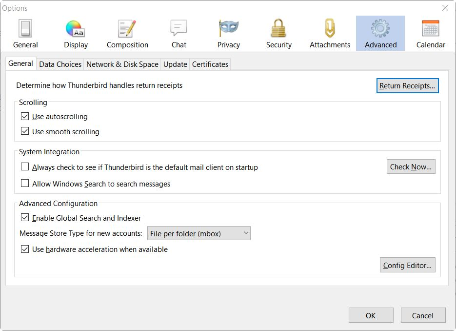 While your here at these options, and since you use Windows 10, in both of those places, also disable the option "Allow Windows Search to search messages". This will keep Thunderbird from freezing up in Windows 10, like many have a problem with.