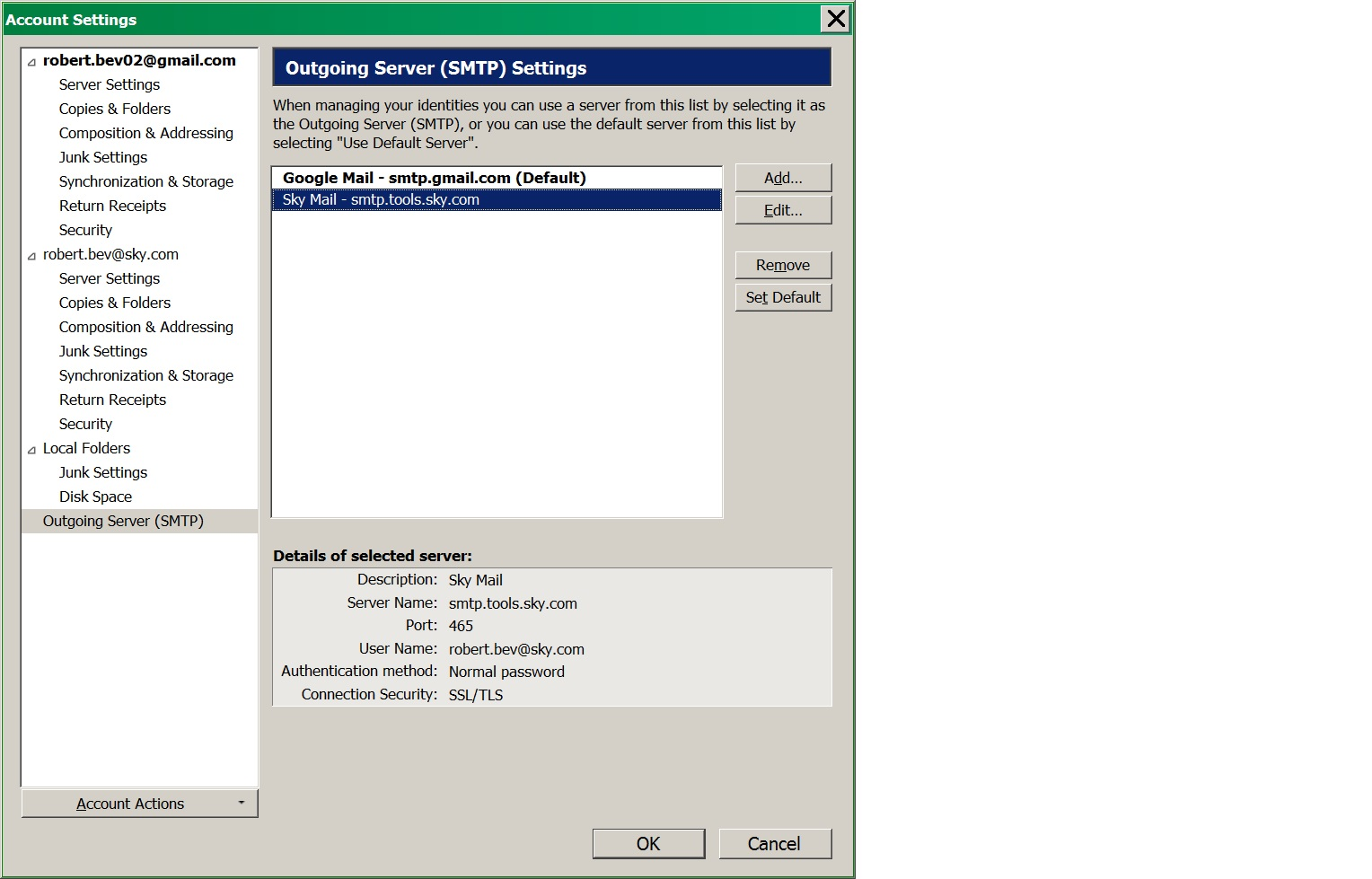 Hi, here is an update After a long weekend of bashing my head against the wall I decided to uninstall Thunderbird again using Revo uninstaller which I did and used the deepest Revo scan to uninstall all associated registry strings, and this time it worked and after reinstalling Thunderbird will now send and receive using both accounts, the only problem is I have zapped my most up to date address book (what a dummy) So now I am actually where I was when I first asked the question as both accounts work but I get the same mails in each account, so I am presuming Thunderbird has used the same in and out ports as default for both accounts. I think most of my problem is caused by my own confusion, and I suppose that the same outgoing smtp port 465 is ok for both accounts, but now I am wondering if a different Incoming port number for the Sky account will solve the problem, regards Robert