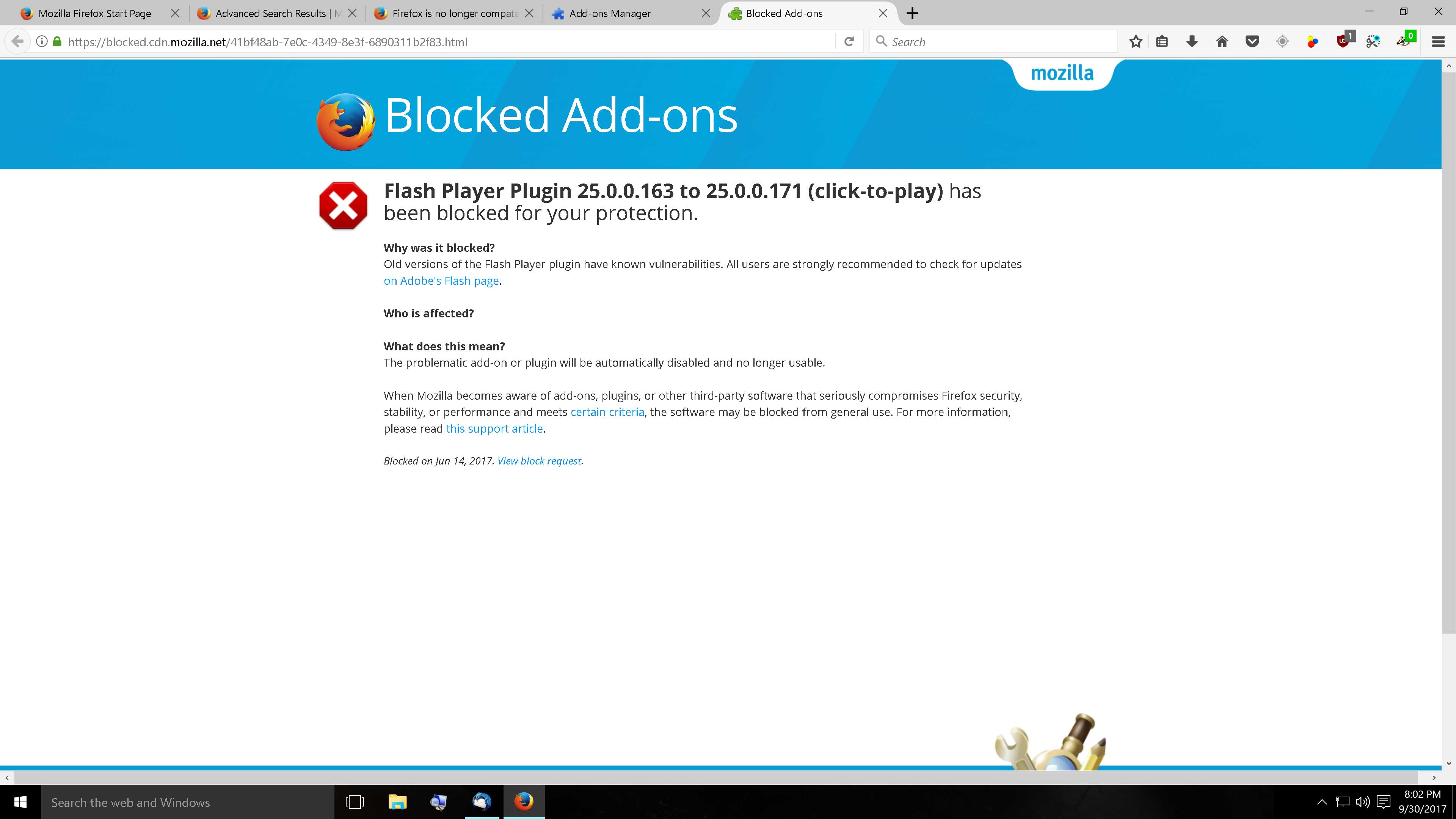 Thank you to those who have responded. I could not find "Flash plugin to always activate" anywhere. I did find that the Flash Player was out of date, however when I attempted to update, Firefox blocked it (see screen shot) saying the update was unsafe. I went to the Flash web site (see screen shot) and I saw the current flash version is way past the version Firefox is blocking. I tried multiple times to install the current version of Flash and each time Adobe says the installation was successful, but each time when I reopened Firefox it still shows the old version. As of today I have had other problems with Adobe with my photo elements program, my best guess is Adobe is charging a fee to license their newer version of flash and Firefox chose not to pay Adobe's ransom price. I bet Adobe is squeezing them by making the older versions not compatible with the newer versions. Not sure if this is right but I bet it is, unfortunately, I will be making a switch, that I did not want to make. Heck I have been with them since they were Netscape in the days of DOS computers.