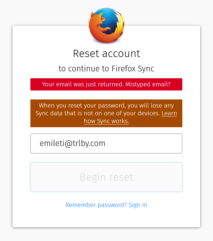 When I just try to enter passwords it could be, I get: The confirmation email we sent to emileti@trlby.com was returned and we’ve locked your account to protect your Firefox data.