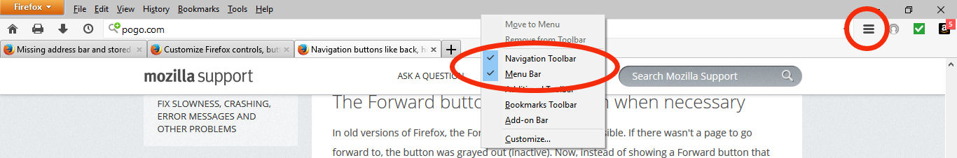 I don't know what happened, but the address bar has disappeared from the toolbar, leaving me with just a long search bar. Also, all of my memorized passwords are gone, although all of my bookmarks remain. And even though I have Firefox set to open displaying the tabs that were open when it was last closed, it no longer does this; it opens to a blank page every time, not even to what is set as my home page. If I click on View/Tools/Customize, nothing happens; same result if I click on the "3-bar."